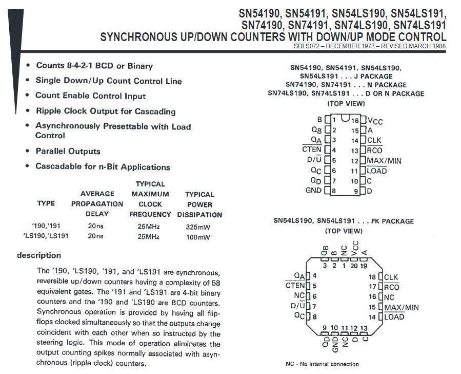PRESETTABLE BCD/DECADE UP/DOWN COUNTERS PRESETTABLE 4-BIT BINARY UP/DOWN COUNTE RS The SN54 / 74LS190 is a synchronous UP/ DOWN BCD Decade (8421) Counter and the SN54/ 74LS191 is a synchronous UP / DOWN Modulo-16 Binary Counter.